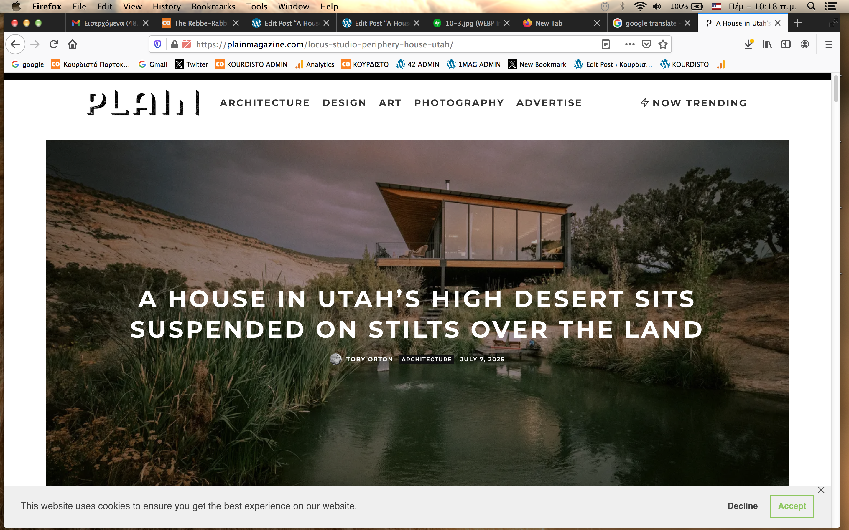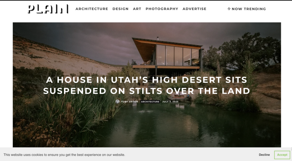 Suspended on stilts in an elevated position in Utah’s high desert, The Periphery House treads light on the land, its raised design and use of materials chosen in reverence to the wild environment. The two-bedroom home was designed by Locus Studio, the structure quietly merging with the rugged landscape that covers this region close to the boundary of the Grand Staircase-Escalante National Monument.